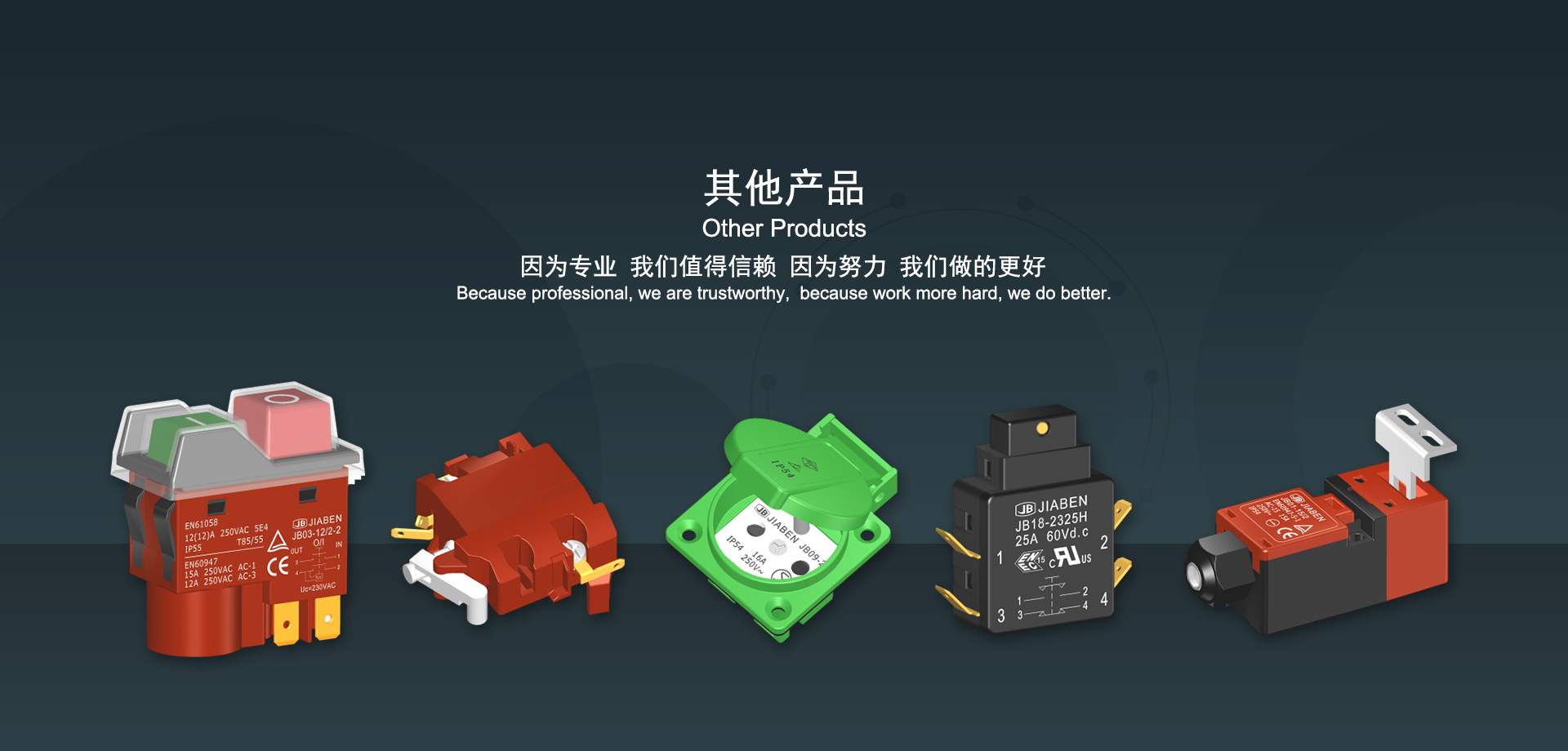 浙江佳奔電子有限公司始建于1986年,坐落于浙江省樂清市虹橋鎮(zhèn)東電子信息產(chǎn)業(yè)園內(nèi),現(xiàn)有職工700多人,資產(chǎn)總額超3億元。公司主要經(jīng)營“JIABEN”牌微動開關(guān)、蹺板開關(guān)、按鈕開關(guān)、扳機(jī)開關(guān)、調(diào)速開關(guān)和電位器開關(guān)等各類交、直流器具開關(guān)和各類交、直流線路板模塊等產(chǎn)品,主要應(yīng)用于交、直流電動工具、電動園林工具、清潔器具、家用電器和小型機(jī)床等行業(yè),是集產(chǎn)品設(shè)計、研發(fā)、制造、銷售和服務(wù)于一體的國家高新技術(shù)企業(yè)。JIABEN was founded in 1986, located in East Electronic Information Industry Park, Hongqiao Town, Yueqing City, Zhejiang Proviance, existing staff more than 700 peoples, more than 300 million RMB worth of assets. Company is mainly engaged in "JIABEN" brand Micro Switch, Rocker Switch, Push-button Switch, Trigger Switch, Speed Regulating Switch, Potentiometer Switch and other kinds of appliance switch and all kinds of AC or DC circuit board module, such as more than 100 series, 8000 kinds of models of products, mainly used in AC or DC Power-tools, Power Gardening Tools, Cleaning Appliances, Household Appliances and Small Machine Tool and other industries, is the collection product design, research and development, manufacturing, sales and service in one of the national high and new technology enterprise.